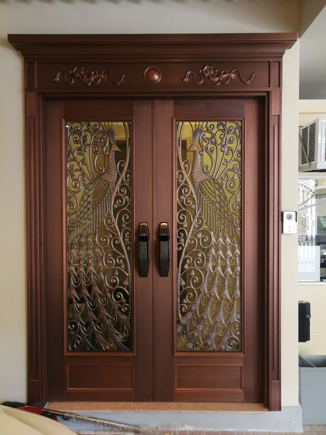 特殊加工:针对室外淋雨,为铜门做更为耐酸耐碱的特殊处理