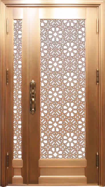产品加工:1.钢质材料经过抗氧化处理后,剪板折弯,焊接成型,2.紫铜板经过氧化拉丝封釉,剪板折弯,依照钢 内胆大小做处各分件后,粘贴于内胆表面,手工工制作成分较多,故此铜门对手工要求是比较高的
