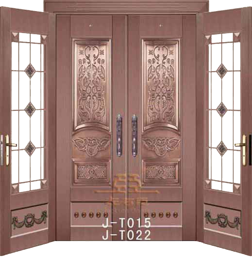 产品加工:1.钢质材料经过抗氧化处理后,剪板折弯,焊接成型,2.紫铜板经过氧化拉丝封釉,剪板折弯,依照钢        内胆大小做处各分件后,粘贴于内胆表面,手工工制作成分较多,故此铜门对手工要求是比较高的