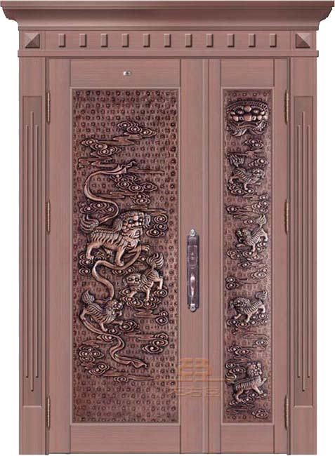 产品加工:1.钢质材料经过抗氧化处理后,剪板折弯,焊接成型,2.紫铜板经过氧化拉丝封釉,剪板折弯,依照钢        内胆大小做处各分件后,粘贴于内胆表面,手工工制作成分较多,故此铜门对手工要求是比较高的