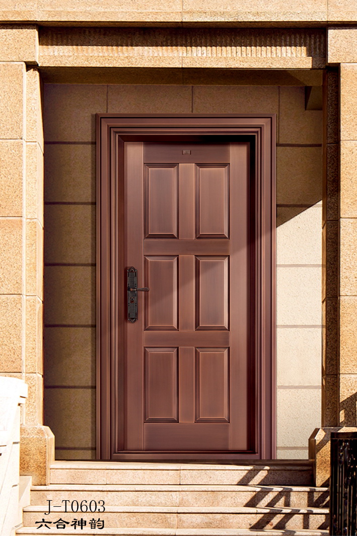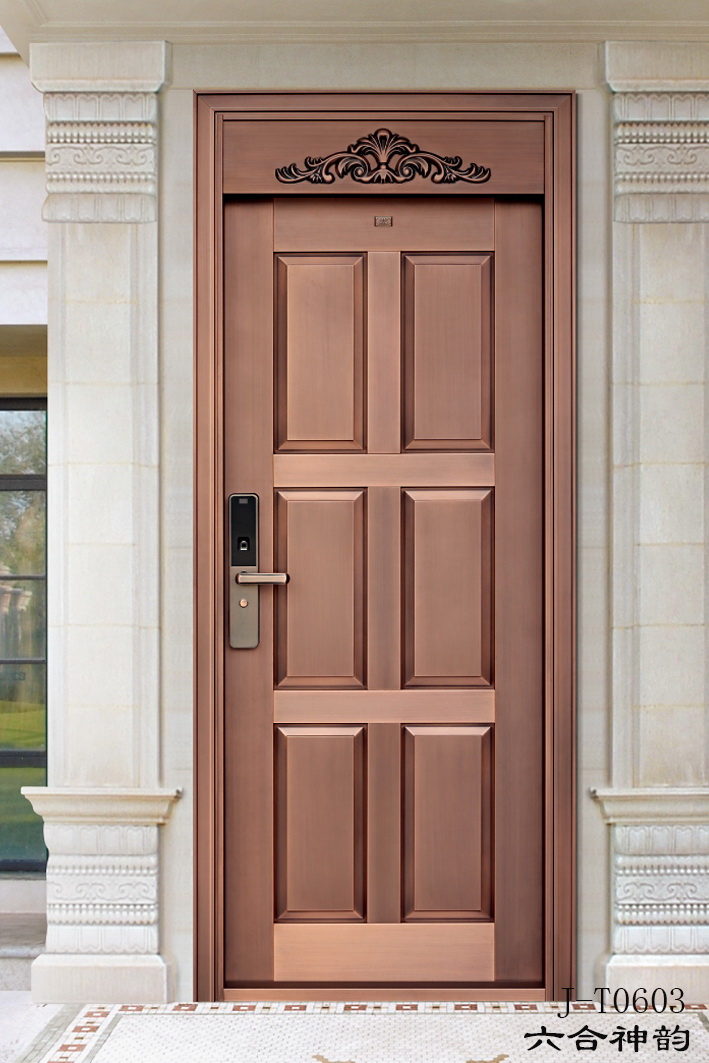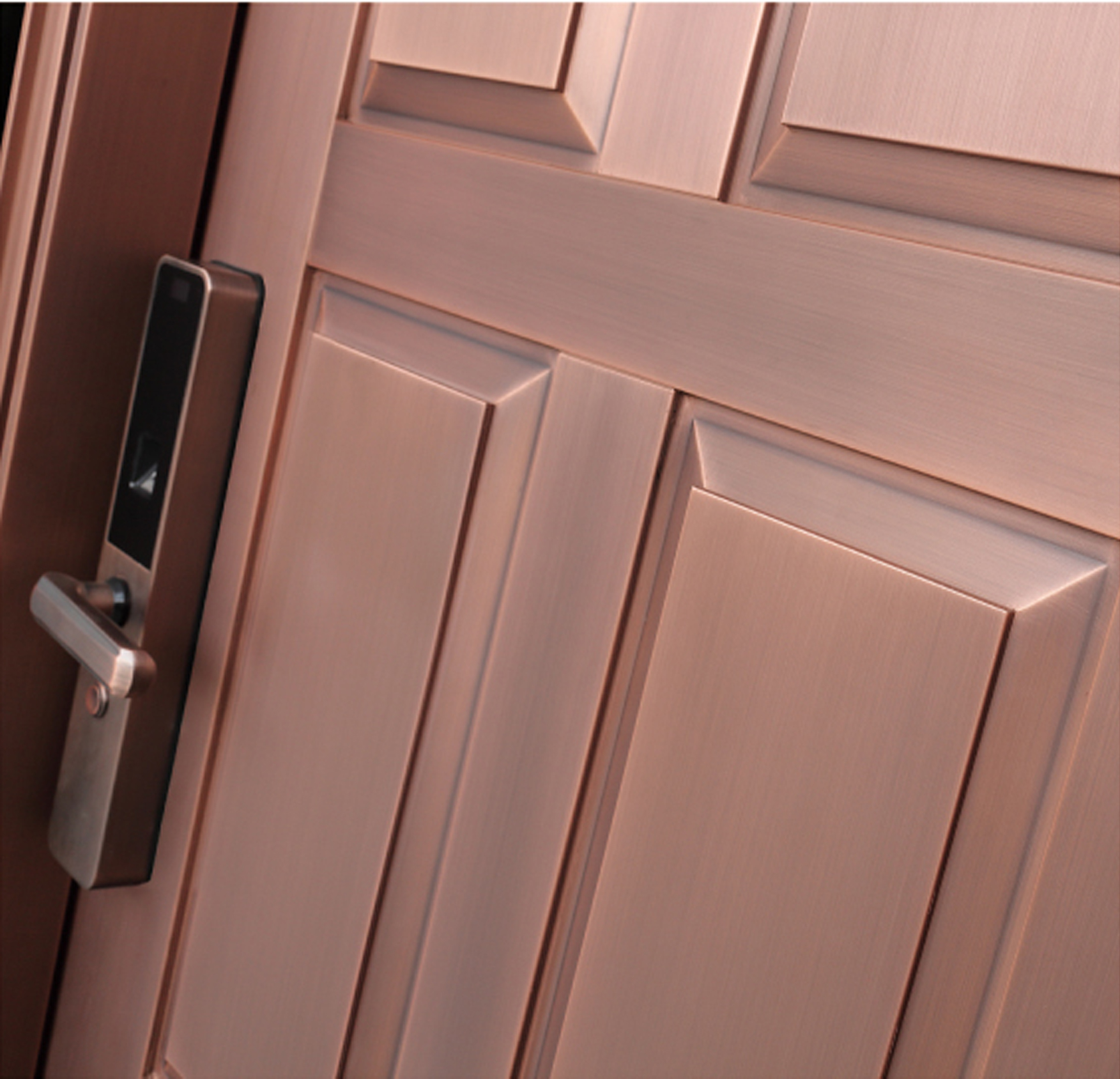 产品加工:1.钢质材料经过抗氧化处理后,剪板折弯,焊接成型,2.紫铜板经过氧化拉丝封釉,剪板折弯,依照钢        内胆大小做处各分件后,粘贴于内胆表面,手工工制作成分较多,故此铜门对手工要求是比较高的