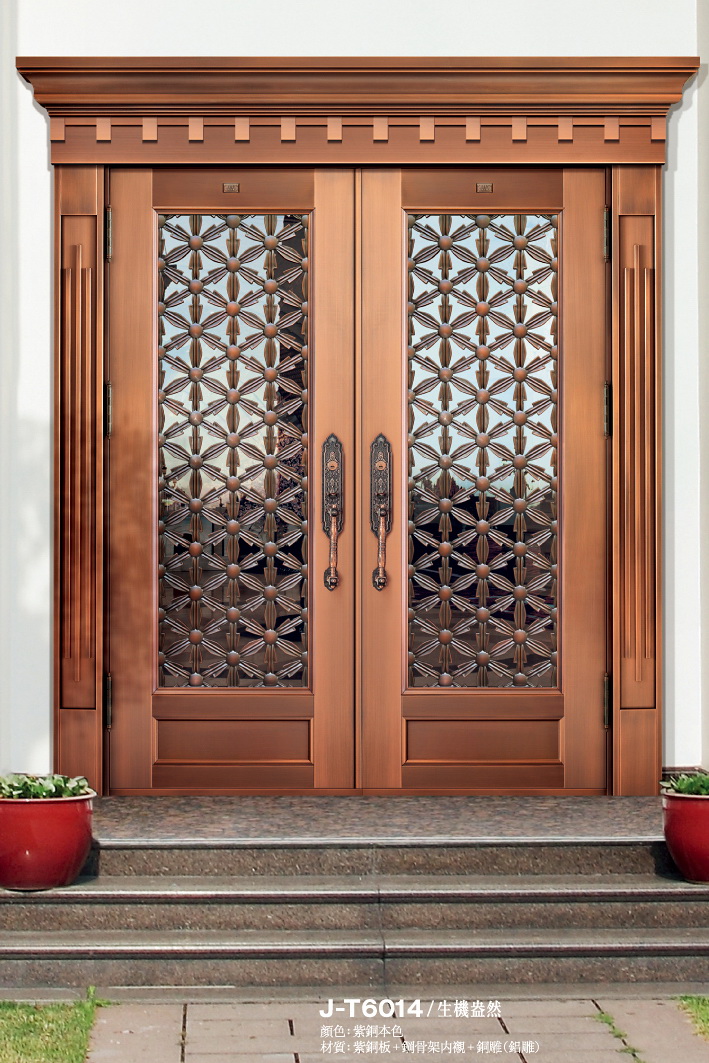 产品加工:1.钢质材料经过抗氧化处理后,剪板折弯,焊接成型,2.紫铜板经过氧化拉丝封釉,剪板折弯,依照钢 内胆大小做处各分件后,粘贴于内胆表面,手工工制作成分较多,故此铜门对手工要求是比较高的