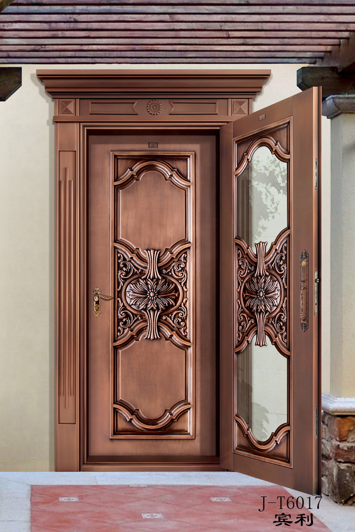 产品加工:1.钢质材料经过抗氧化处理后,剪板折弯,焊接成型,2.紫铜板经过氧化拉丝封釉,剪板折弯,依照钢 内胆大小做处各分件后,粘贴于内胆表面,手工工制作成分较多,故此铜门对手工要求是比较高的